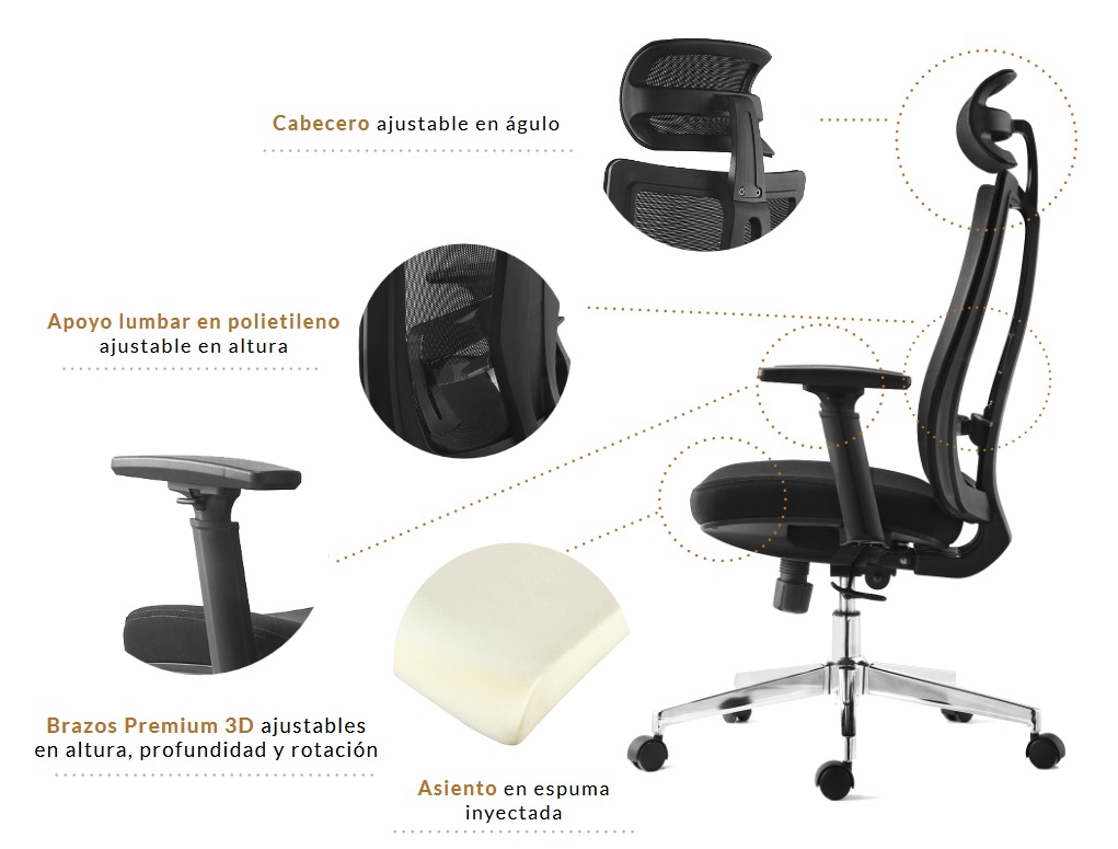 Cabecero ajustable en altura y ángulo, apoyo lumbar con curvatura ergónomica, con amortiguación independiente, brazos premium 3D, ajustables en altura, profundidad y rotación. Asiento en malla respirable de alta resistencia